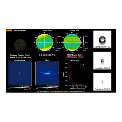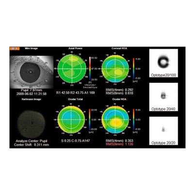 | Особенности | 5 функций в 1 (аберрометрия волнового фронта, топография роговицы, рефрактометрия, кератометрия и пупиллометрия) Непревзойденная воспроизводимость и надежность Поддержка решения для хирургии катаракты и рефракционной хирургии Последовательность изображений волнового фронта Оценка симуляции остроты зрения Полностью автоматическое выравнивание Простота управления Встроенное программное обеспечение для оценки Подключение к IMAGEnet |